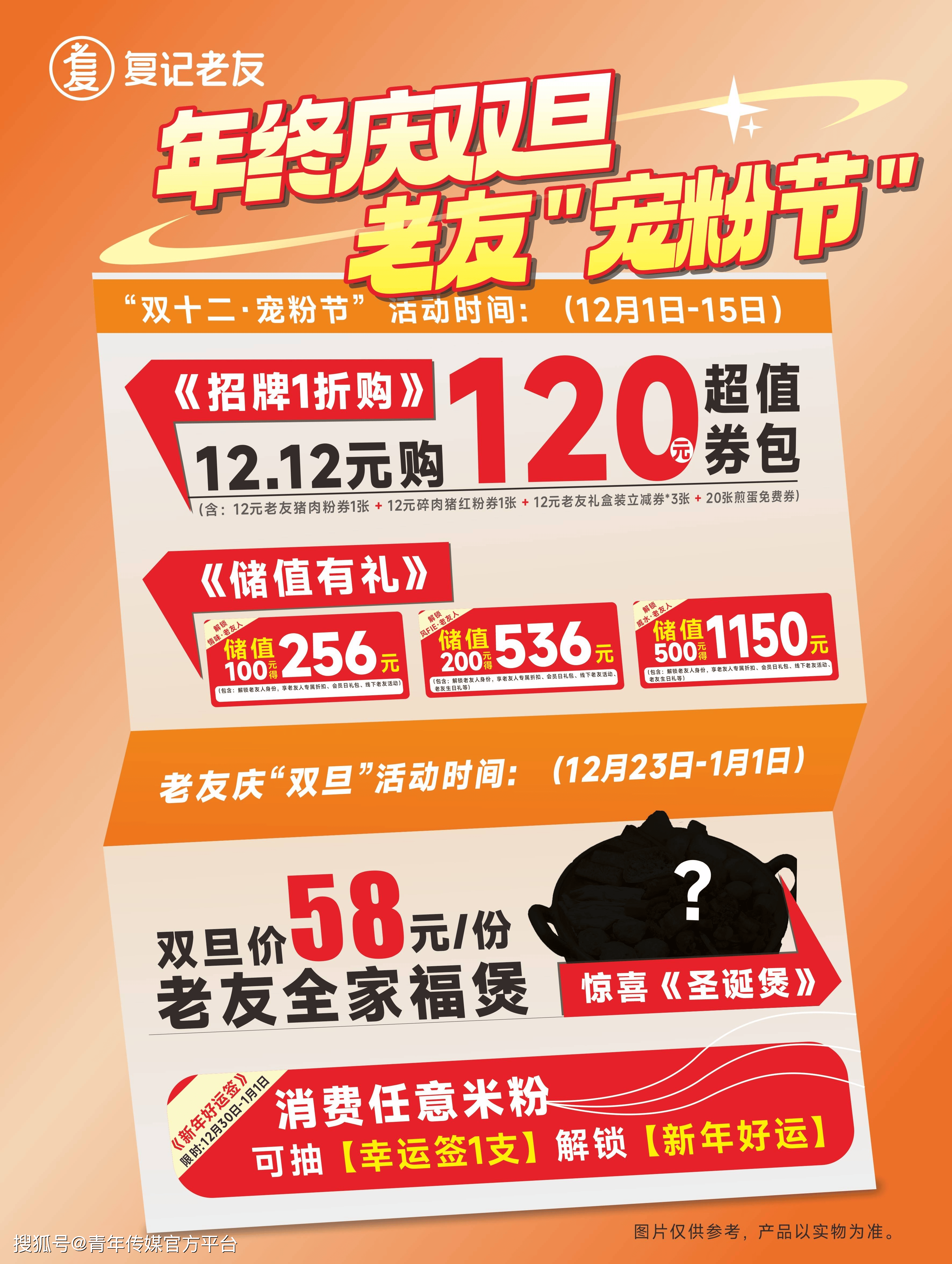 在歲末年初的溫馨時刻,復(fù)記老友精心籌備了一場盛大的“年終寵粉月”活動,回饋廣大顧客的支持與厚愛,同時慶祝雙十二與雙旦節(jié)日的到來。本次活動將貫穿整個十二月,通過豐富的促銷活動和貼心的服務(wù),讓顧客在享受美食的同時,感受到濃濃的節(jié)日氛圍和復(fù)記老友的溫暖關(guān)懷。